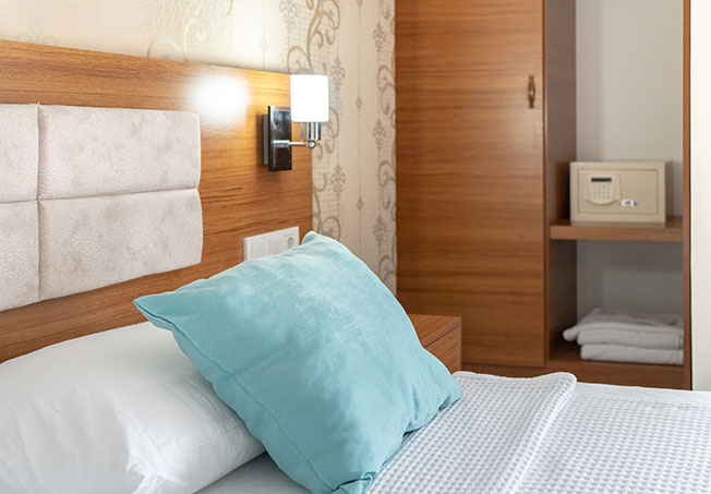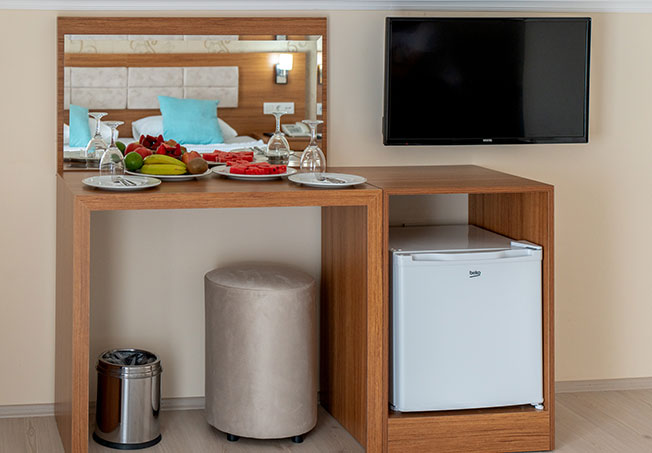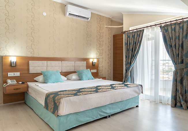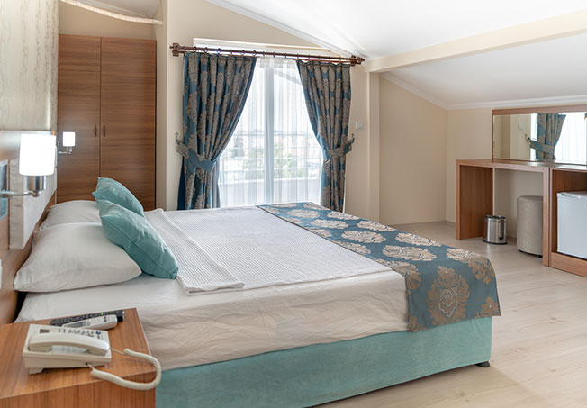 Modern dekore edilmiş ve oldukça ferah alana sahip 22 m²’lik, laminant-granit zemin ile kaplanmıştır. Büyük ikili yatak ya da tek kişilik iki yatak bulunmakta olup, aydınlatma sistemi led teknolojisidir. Split klima, minibar, Lcd TV, emanet kasası, gardrop, makyaj masası, balkon, banyoda duşakabin ve WC, saç kurutma makinesi olmak üzere tatil konaklaması için tüm ihtiyaçlarınızı karşılayacak şekilde hazırlanmıştır.