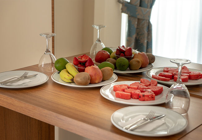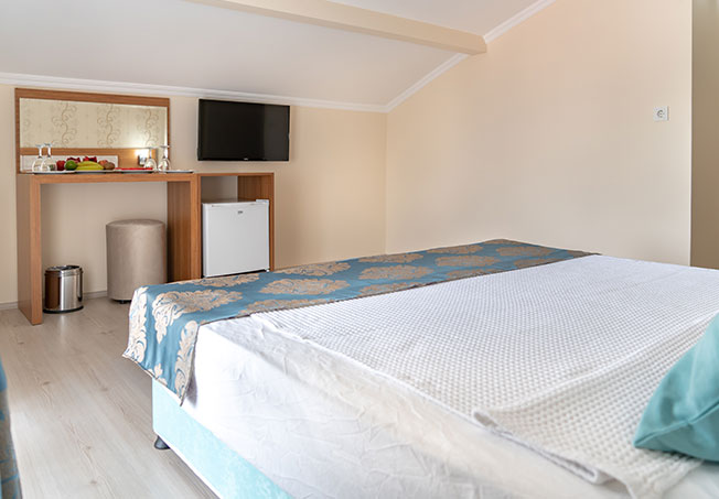 Modern dekore edilmiş ve oldukça ferah alana sahip 30 m²’lik, laminant-granit zemin ile kaplanmıştır. Büyük ikili yatak ve bir tek kişilik yatak bulunmakta olup, aydınlatma sistemi led teknolojisidir. Split klima, minibar, Lcd TV, emanet kasası, gardrop, makyaj masası, balkon, banyoda jakuzi küvet ve WC, saç kurutma makinesi olmak üzere tatil konaklaması için tüm ihtiyaçlarınızı karşılayacak şekilde hazırlanmıştır.
